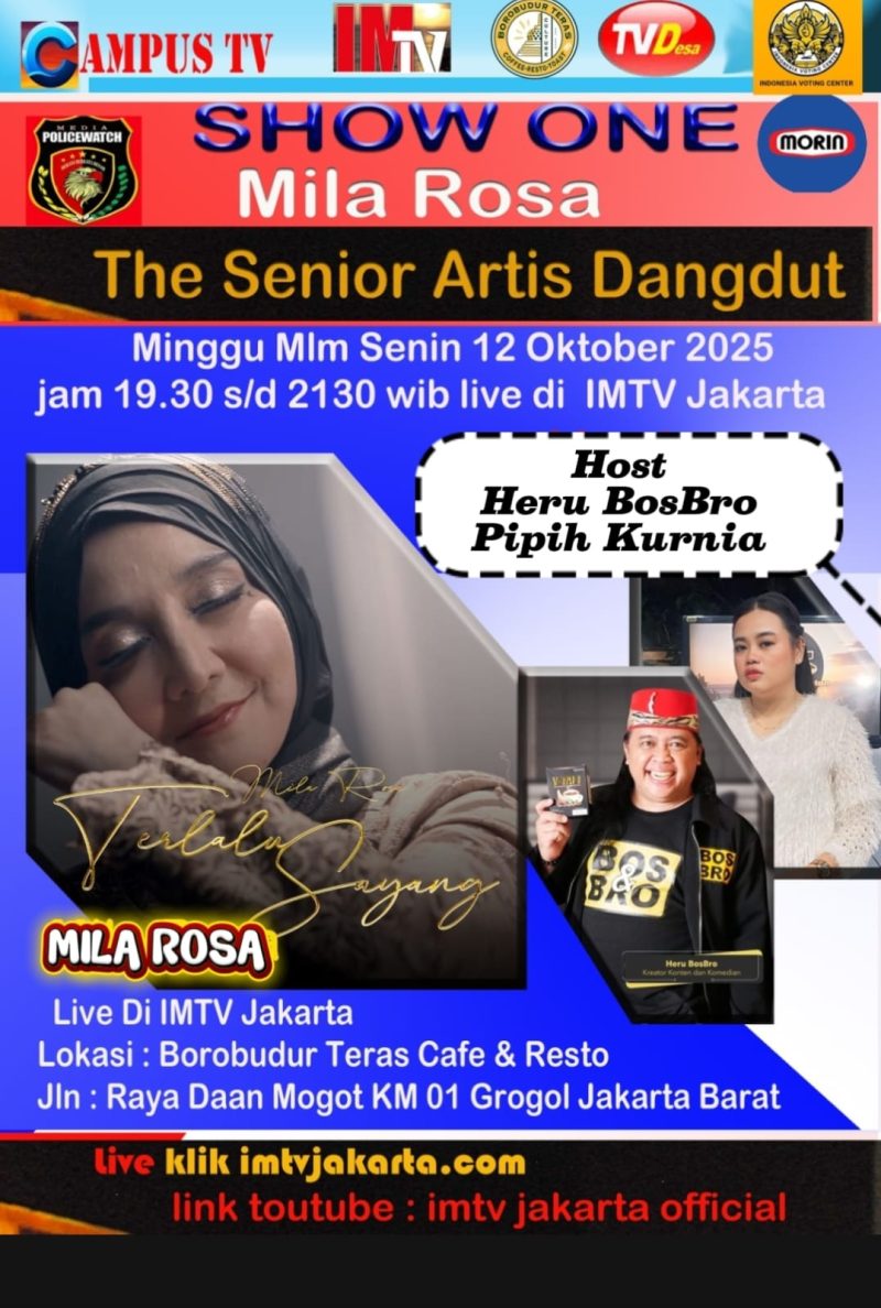 Sedangkan pada hari Minggu 12 Oktober 2025 Mila Rosa akan tampil full dua jam membawakan lagu barunya dan lagu hits-nya di acara SHOW ONE pada pukul 19.30 – 21.30 WIB di channel IMTV Jakarta secara Live di aplikasi IMTV JAKARTA dan channel YouTube IMTV JAKARTA, bersama host Pipih Kurnia dan Heru BosBro.