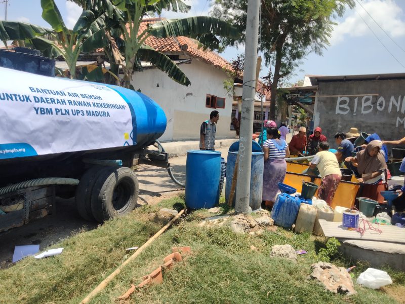 Musim kemarau tahun ini menyebabkan sejumlah desa mengalami kesulitan mendapatkan air untuk kebutuhan sehari-hari seperti memasak, mandi, dan mencuci. Kehadiran mobil tangki air dari YBM PLN UP3 Madura pun disambut antusias oleh masyarakat. Warga berbondong-bondong datang membawa berbagai wadah untuk menampung air bersih yang disalurkan.
